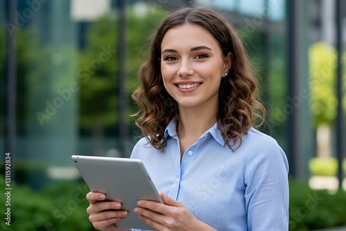 Confident Young Businesswoman Holding a Tablet Outdoors in a Modern Corporate Setting, Radiating Professionalism and Enthusiasm, Embracing Technology and Innovation While Preparing for a Successful Wo