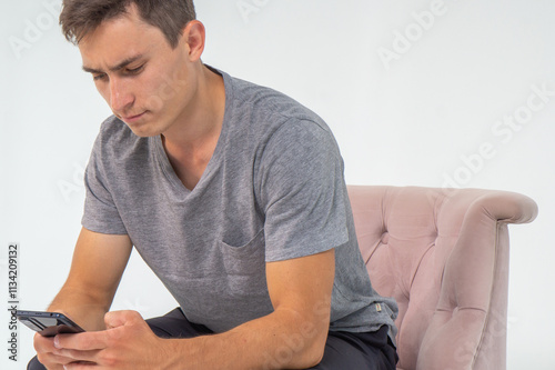 man, communicate, mobile phone, typing, sitting, young, guy, photogenic, model, copy space, white background, advert, armchair, indoor, studio