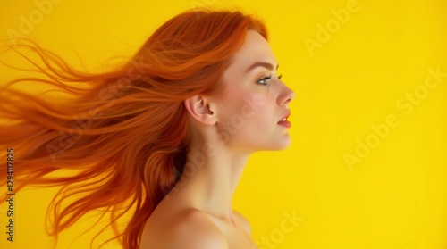 hair, redhead, profile, yellow, background, beauty, portrait, model, wind, movement, flowing, natural, make-up, skin, lip, eye, shoulder, bare, studio, lighting, vibrant, dynamic, elegant, graceful, feminine, fashion, minimal, simple, modern, artistic, dramatic, striking, expression, pose, half face, ginger, orange, bright, clean, fresh