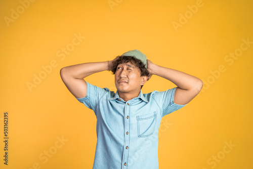 confused young muslim woman feeling uncertain about her life choice isolated on orange background