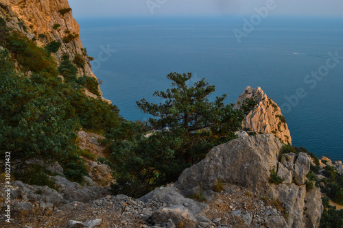 coniferous green trees and bushes grow among large stones, sharp rocks on shores of Black Sea, in warm orange light of sunset. Crimea