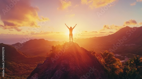 Conquering the Summit: Silhouette of a Person Triumphantly Reaching the Peak at Sunrise