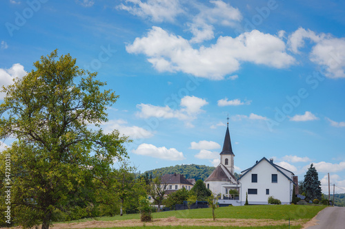 Conques village in France in summer day. the small town of Walshwiller in France. Church of the Eglise de Wolschwiller