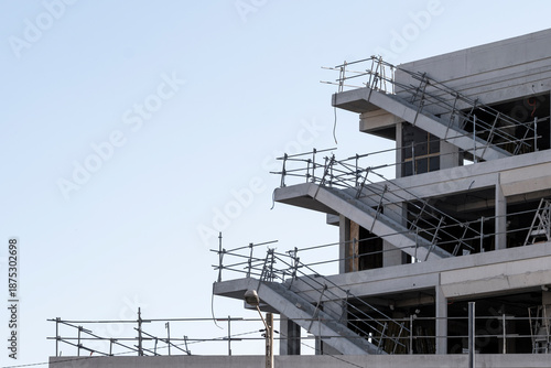 construction, crane, building, architecture, urban, development, property, concrete, scaffold, montpellier, france, europa, city, exterior, facades, structure, framework, steel, cement, unfinished, modern, new, progress, project, site, engineering, contractor, investment, residential, housing, district, planning, growth, expansion, stair, staircase, platform, railing, level, floor, skeleton, detail, closeup, pattern, shadow, sunlight, daylight, blue, sky