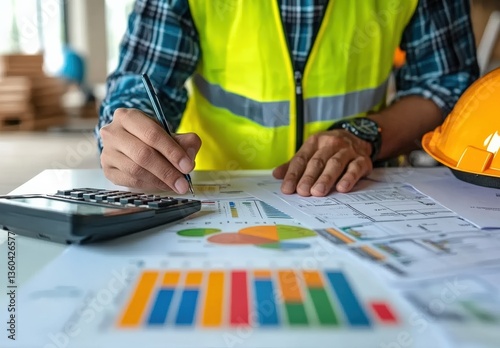 construction, safety, analysis, graph, chart, engineer, budget, project, calculating machine, note, blueprint, graph, vest, helmet, desk, site, architecture, plan, engineering, cost, expense, investment, datum, finance, calculation, development, building, industry, professional, occupation, men at work, job, design, paperwork, accounting, business