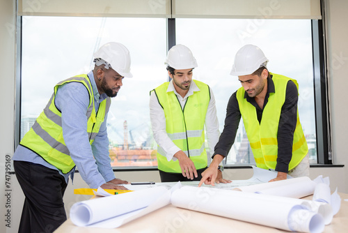 Construction engineer with technician designer team working build site inspect for interior renovate in industry workshop building with floor plan.