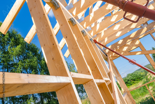 construction, wooden, frame, building, blue, sky, carpenter's shop, structure, men at work, tool, framing, architecture, timber, roofing, project, daylight, progress, development, craftsmanship, material, safety, site, engineering, sunlight, landscape, nail, screw, scaffolding, equipment, support, inspection, foundation, beam, joinery, environment, assembly, hard, hat, labor, residential, renovation, design, modern, technique, outdoors, improvement, framework, manpower