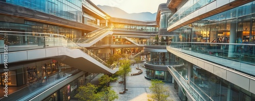 Construction of modern shopping mall, busy urban area, contemporary design, consumer lifestyle