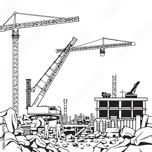 construction site, development, project, structure, site, crane, industry, urban, construction, equipment, architecture, building, city, graphic, heavy, helmet, infrastructure, labor, lifting, machine, silhouette, steel, architect, tower, work, business, home, illustration, man, modern, white, black, concept, design, house, vector, background, flat, building construction, men at work