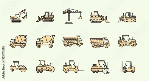 construction, heavy machinery, building, vehicle, equipment, engineering, industry, machine, line art, outline, vector, graphic, illustration, symbol, pictogram, shoveling, bulldozer, crane, cement mixer, dump truck, forklift, shoveling, loader, truck, roller, site, project, development, infrastructure, architecture, urban, work, process, tool, heavy duty, transportation, lifting, compacting, mixing, digging, hauling, renovation, maintenance, fleet, industrial