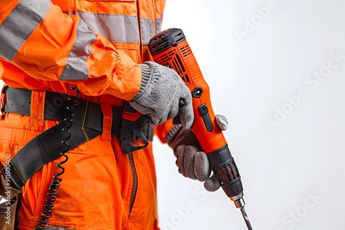 construction, men at work, power, drill, tool, equipment, machinery, industry, building, repair, maintenance, professional, job, work, safety, protective, gear, orange, uniform, isolated, background, white, copy, space, technology, hardware, electric, handyman, bricolage, craftsman, construction site, job site, construction worker, hard hat, wrench, hammer, screwdriver, plier, power-tool