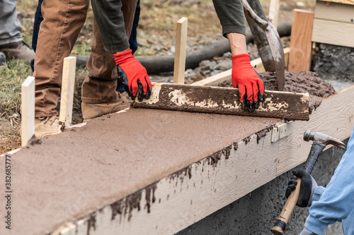Construction Worker Leveling Wet Cement Into Wood Framing