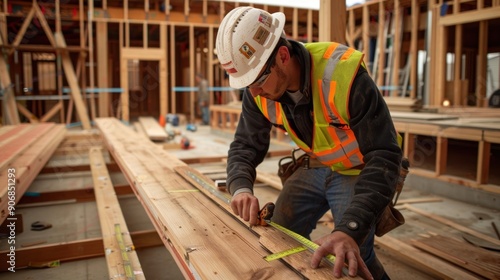 construction, men at work, measuring, beam, wood, building, site, house, framing, carpenter, timbering, tool, tape, safety, hard hat, vest, labor, work, professional, skill, project, trade, job, blueprint, contractor, architect, engineer, industry, development, manual, hand, equipment, workwear, teamwork, progress, material, sharpened, determination, man, male, adult