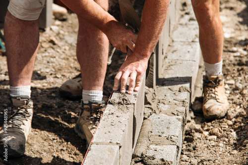 construction, men at work, concrete, block, building, site, foundation, laying, teamwork, labor, masonry, sunny, tool, precision, equipment, craftsmanship, industry, boot, dirtied, levelling, material, architecture, project, labourer, structure, dirt, safety, hand, task, renovation, sidewalk, bricklaying, collaboration, man, movement, strength, effort, stance, groundwork, men at work, hand, working