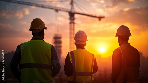 construction, men at work, sunset, crane, building, site, safety, gear, teamwork, engineering, architecture, industrial, development, project, hard hat, vest, silhouette, sky, dusk, infrastructure, labor, industry, planning, progress, urban, city, equipment, machinery, construction site, construction industry, construction equipment