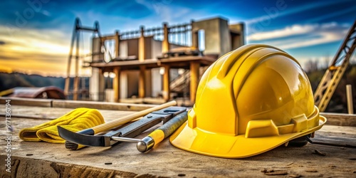 Construction Worker's Tools - Safety Helmet, Hammer, and Wrench on Wooden Plank, Construction, Building, Safety Equipment, Construction worker