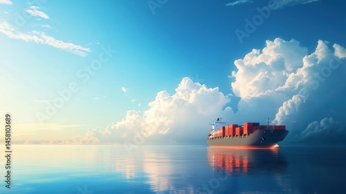 Container ship sailing on a serene sea under a breathtaking cloudy sky