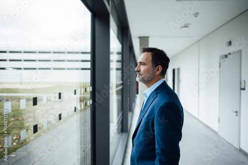 Contemplative businessman looking through glass window in corridor