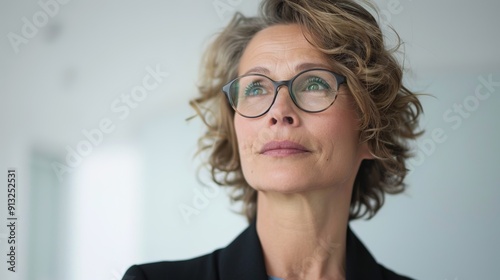 Contemplative Middle-Aged Woman with Glasses in Formal Attire Posing in Modern Studio
