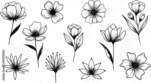 Contemporary abstract minimal tattoo flower collection. Vector illustration. Ink hand drawn wild flowers set. Abstract plants art in charcoal or crayon drawing style. Pencil drawn floral elements