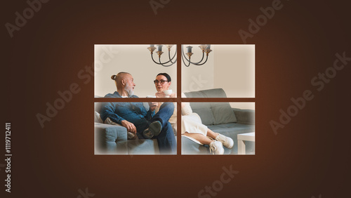 Contemporary art collage. Elderly couple sitting together on couch, drinking coffee and having deep conversation, framed through window. Concept of family-time, winter holidays, Christmas Eve. Ad