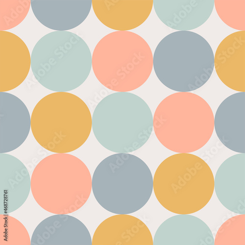 Contemporary geometric seamless mid-century pattern with circles in pastel retro palette on a light background. Abstract vector background in scandinavian style. Trendy graphic bauhaus design.