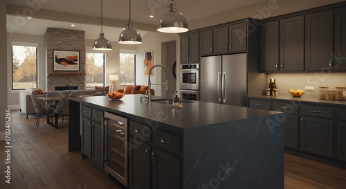 Contemporary Kitchen and Dining Area with Dark Gray Cabinets and Large Island
