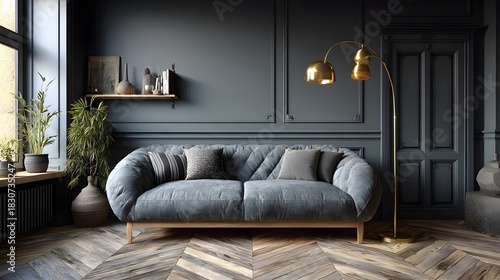 room, living, sofa, couch, home, interior, design, furniture, grey, modern, style, luxury, apartment, house, floor, wood, wooden, herringbone, lamp, brass, gold, light, wall, decoration, decor, minimalist, clean, comfort, cosy, relax, warm, evening, night, atmosphere, lifestyle, residence, property, real, estate, architecture, texture, fabric, cushion, pillow, empty, space, background, contemporary, elegant