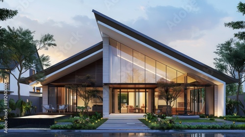 Contemporary minimalist home with a unique roof design and large front windows, surrounded by a simple garden