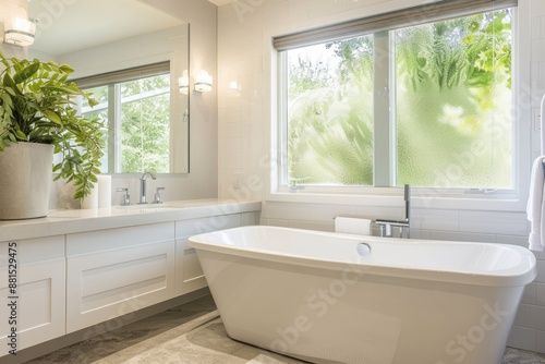 nobody, indoor, home, beautiful, interior, bathroom, apartment, luxury, room, design, minimal, house, white, window, modern, bathtub, wall, mirror, background, privies, laundered, three-dimensional, cosy, hotel, tile, faucet, marble, clean, floor, minimalist, plant, contemporary, decoration, furniture
