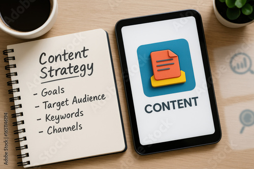 Content strategy goals target audience keywords channels written notebook with digital tablet