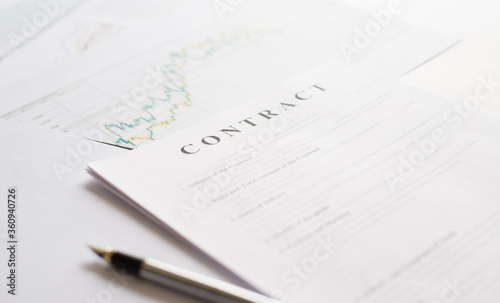 Contract paper and pen on white desk background. Focus on title Contract. Defocused pencil.