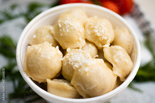 Cooked dumplings with cheese in a deep bowl