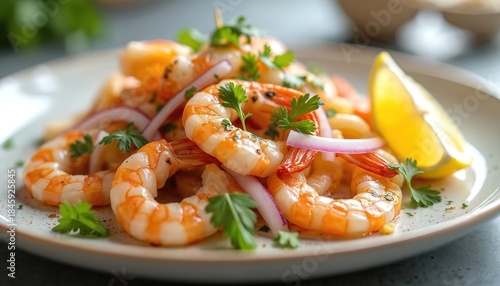 shrimp, seafood, salad, food, dish, meal, plate, cookery, epicure, delicious, fresh, cooked, healthy, eating, light, diet, dinner, lunch, receipe, ingredient, prepared, culinary, art, gastronomy, eatery, kitchen, garnish, cilantro, onion, red onion, lemon, wedge, slice, olive oil, dressing, mixed, appetising, seafood salad, marinated, main course, side, party, celebration, photo, styling