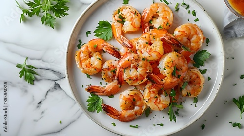 Cooked shrimp on a white ceramic plate, fresh parsley garnish, white marble tabletop, top view, food photography, natural light, vibrant colors, gourmet presentation.