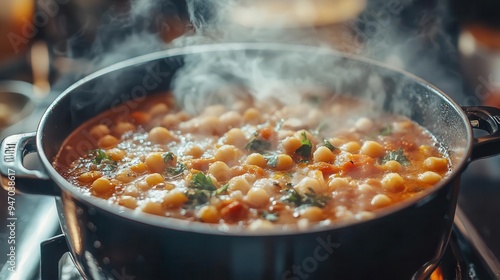 Cooking pot with lid simmering a dish, with focus on comfort food