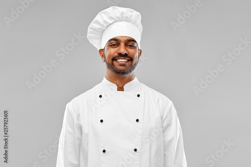 cooking, profession and people concept - happy male indian chef in toque over grey background