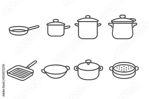cookware, line, icon, style, frying, pan, saucepan, stock, pot, pressure, cooker, grill, wok, dutch, oven, steamer, basket, no, text, label, isolated, transparent, background, frying pan, pressure cooker