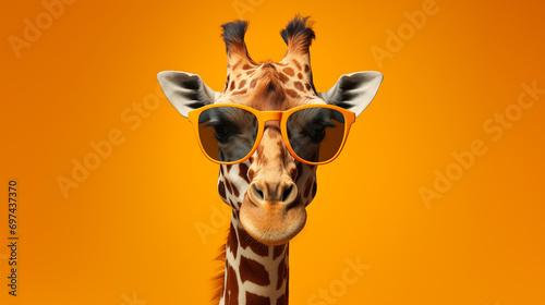 Cool giraffe in sunglasses on a yellow background as a business advertising concept, with copy space