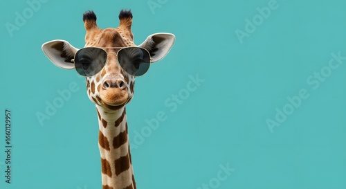 Cool giraffe sporting aviator sunglasses against a vibrant teal background, exuding playful confidence and style.