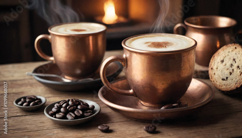hot drink, cup, copper, steaming, bean, cookie, cosy, kitchen utensile, beverage, elegant, rustic, warm, wooden, atmosphere, design, closeup, epicure, snack, handcraft, comfort, aroma, chic, serving, homemade, delicious, culinary, decoration, texture, minimalistic, inviting, coffee, afternoon, treat, relaxation, companionship, bakery, comforting, preparation, stylish, aesthetic, hearty