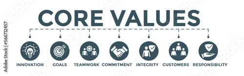 Core values concept banner. Editable vector illustration with innovation, goals, teamwork, commitment, integrity, customers, and responsibility icon .