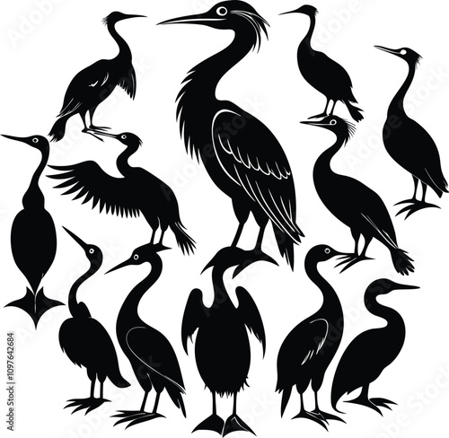 Cormorant Bird Silhouettes Vector Illustration: Black and White Graphic Design of Aquatic Birds in Circle Formation for Ornithology Resources