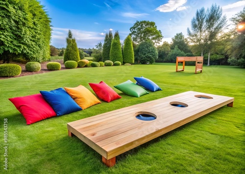 Corn hole boards and beanbags arranged on a grassy field for outdoor game entertainment