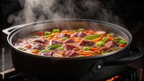 Corned beef and cabbage concept. A steaming pot of savory beef stew with colorful vegetables simmering in rich broth.