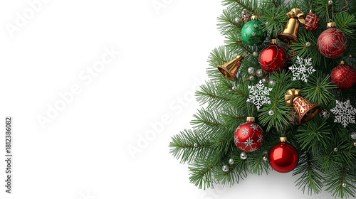Corner composition of fir branches decorated with New Year's toys on a white background with space for text on the left side of the Christmas banner, top view