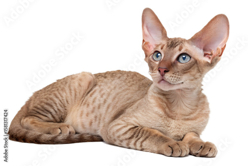 Cornish rex cat isolated, elegant curly-coated breed with large ears and slender body