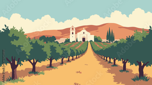 Corona, CA – Citrus groves and the historic Mission with hill backdrop, palette: citrus yellow, mission cream, olive, terracotta