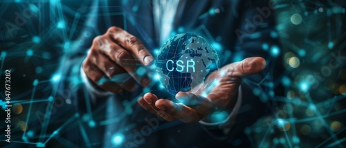 Corporate Social Responsibility, Businessman in suit holding glowing globe with csr text in hand, world innovation