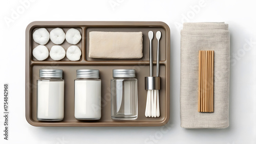 cosmetic, tray, cotton, pad, jar, bottle, liquid, clear, glasses, silver, lid, swab, applicator, metal, holder, clothes, fabric, beige, neutral, organised, clean, hygiene, beauty, skincare, spa, wellness, top, view, overhead, setup, arrangement, still, life